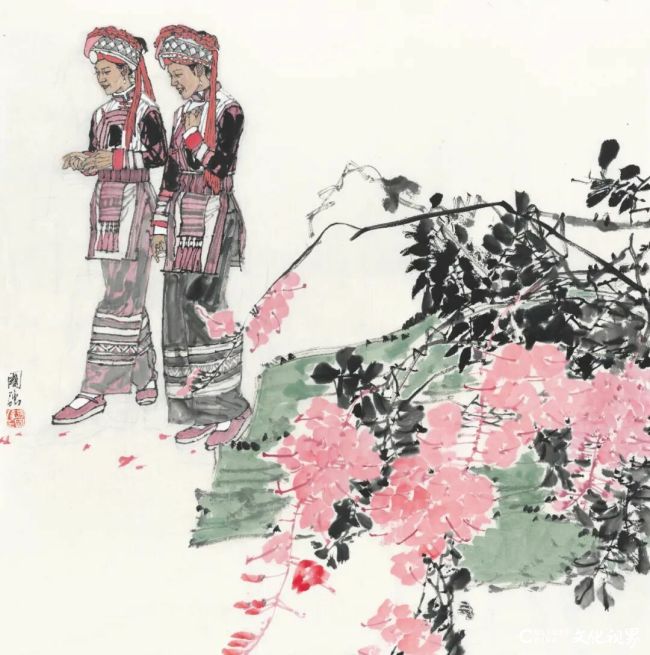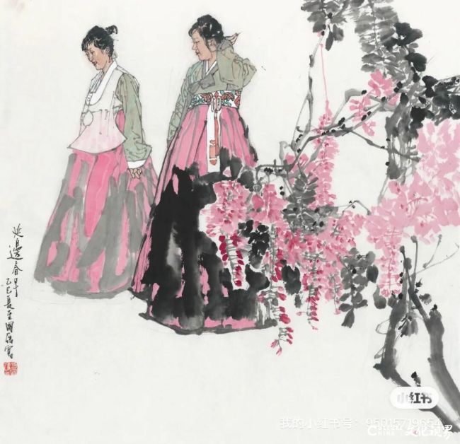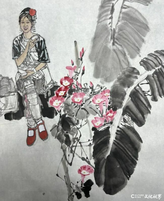 尤为动人的是他对“意境”的营造。背景中的紫藤、泡桐与人物并非简单的配景,而是情感的延伸:朝鲜族少女身旁的粉花与裙裾相映成趣,苗族姑娘身后的蓝花藤与银饰互为映衬,让人物在自然的氤氲中更显鲜活。这种“人景共生”的处理,让画面跳出单纯的肖像叙事,成为兼具笔墨意趣与人文关怀的生命图景。