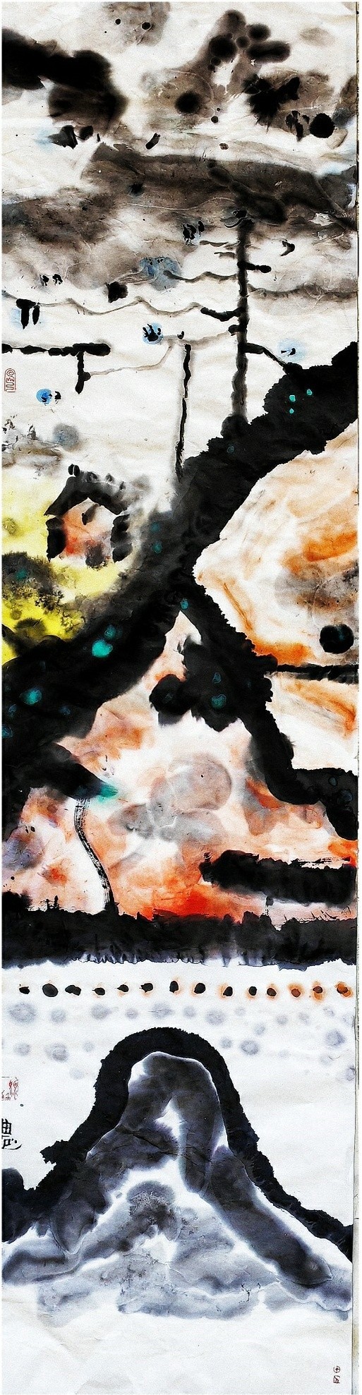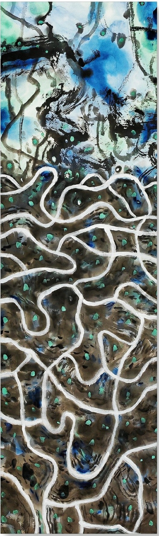 油彩与墨韵共生,笔锋与肌理交融,顾致农以油画家的独特视角,在水墨与书法的疆域里踏出了一条跨界探索的幽径。他没有将油画的写实肌理与水墨的写意精神割裂对立,而是让二者在画布上相互浸润、彼此成就,如同风与云的邂逅,自然生长出兼具东方气韵与现代质感的艺术语言。那些流动的墨色并非简单的渲染,而是承载着书法笔意的筋骨,每一道笔触都暗含着提按转折的韵律,既有油画颜料堆积的厚重,又有水墨晕染的空灵,让观者在虚实之间感受到艺术表达的无限可能。