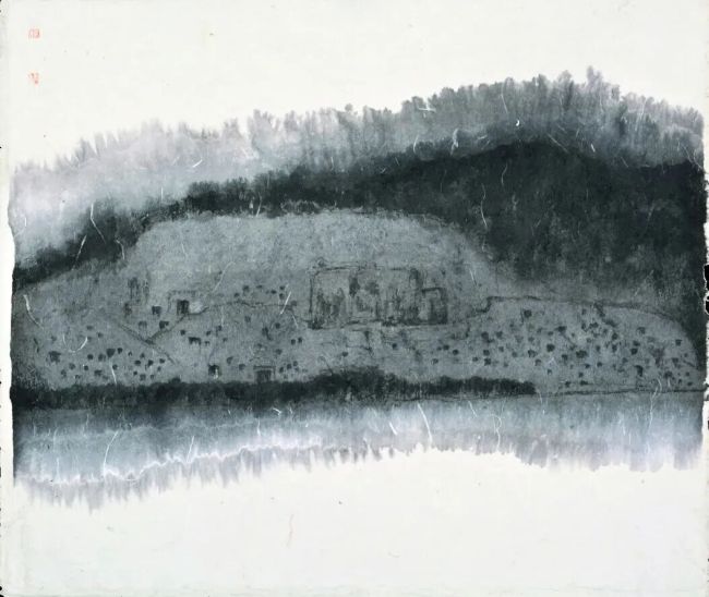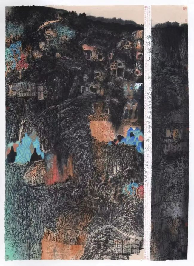当时以烟岚迷朦的意象来体现龙门石窟的状态,特别是让大家感受到夕阳西下,黄昏时分,整个山色黯沉与光线混沌朦胧交汇相融,似乎有黄宾虹说的那种如夜行山一般。所有的物景都笼罩在这样的调性里。画面试图水墨淋漓又迷朦如幻,同时又显现一些微妙细节的变化,表达山水龙门、暮色龙门的多方法的描绘。