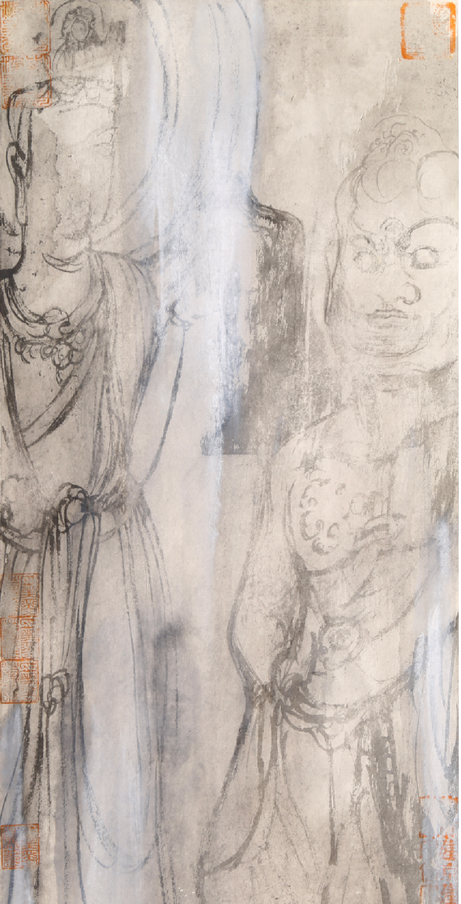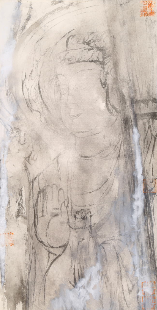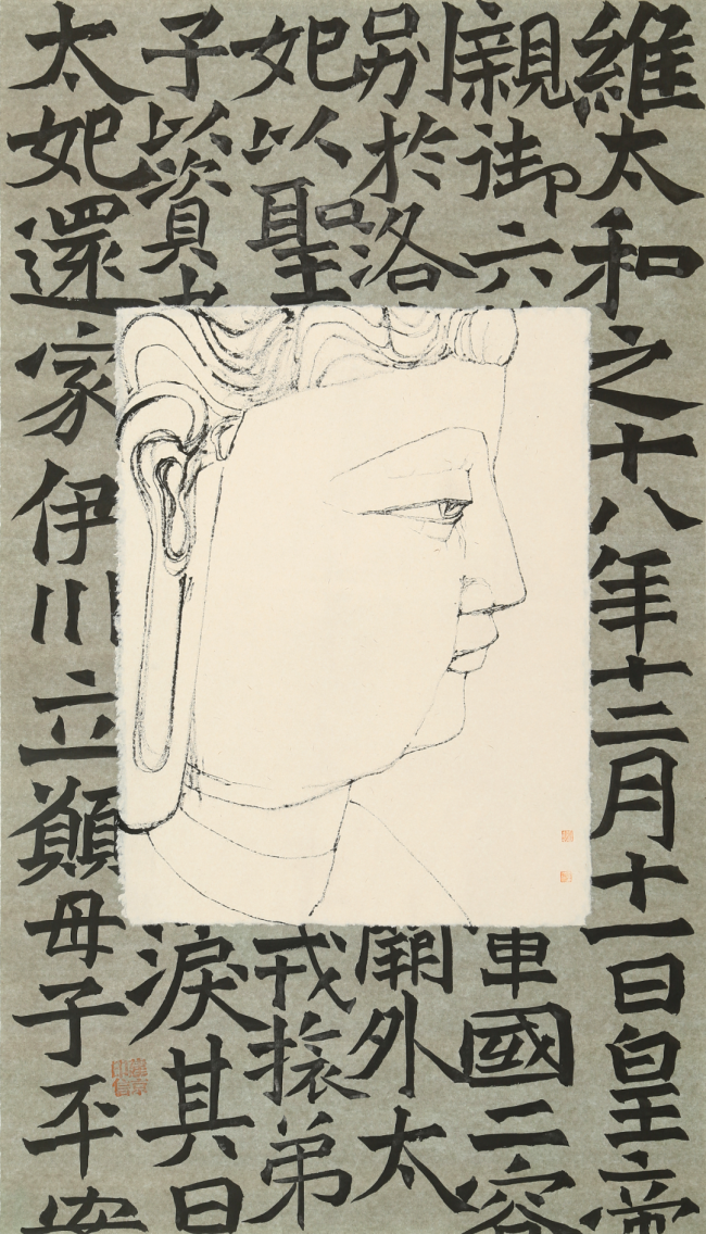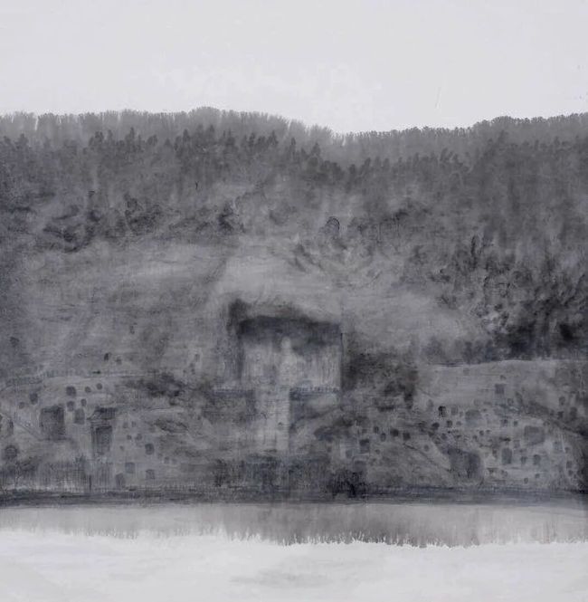 2010年,张建京首次以水墨形式表达龙门,创作《我的城》系列之《龙门山色》《马寺钟声》,以烟岚迷朦的意象勾勒暮色中的龙门,水墨淋漓、迷朦如幻。此后,龙门元素逐渐成为他画面中的核心符号,从《龙门气象》中对西山外景的图腾化概括,到《伊阙故道》对历史肌理的细腻描摹,再到《龙门心相》《相像》系列对造像精神的抽象提炼,他不断探索水墨与龙门的融合边界,将线描、拓片、石刻等艺术形式融入创作,让龙门石窟的艺术精华在当代笔墨中焕发生机。