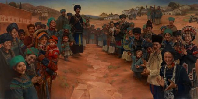庞茂琨《彝家新村欢迎您》布面油画 300×600cm 2021年