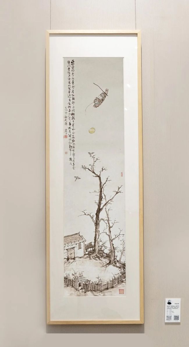 《钓月图》这幅作品,以“诗意入画”为核心,借传统笔墨重构文人隐逸的精神图景。作品承续文人画“笔墨抒情”传统,以枯润交织的笔墨刻画枯树、村舍与渔舟,在宋元山水技法(枯笔皴擦、空灵留白)的借鉴中,赋予传统语言现代质感;紧扣“钓月”诗意,通过意象化处理(夸张枯树造型、极简空间布局)与题跋诗词的意境呼应,将文学意象转化为视觉符号,实现“诗画交融”;同时以渔舟、孤村等元素,具象化文人“隐逸江湖、澄怀味象”的精神追求,在传统笔墨与当代审美、诗意营造与人文表达的融合中,完成对中国文人精神内核的当代诠释。