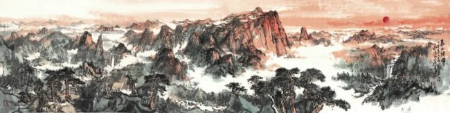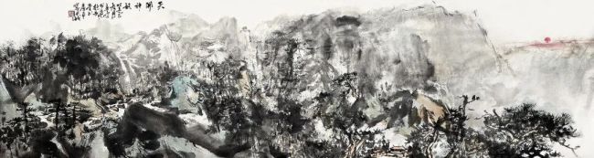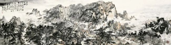 “泰山系列”“黄山系列”“三峡系列”中,古典笔墨的韵味、现代审美的气息与写生的真切感悟交织,营造出开阔苍茫、豁达洒脱的境界,《云山深处几人家》便是代表,山川朴茂、云气苍茫,小桥民居点缀其间,尽显画家驾驭自然物象的宽广胸襟。