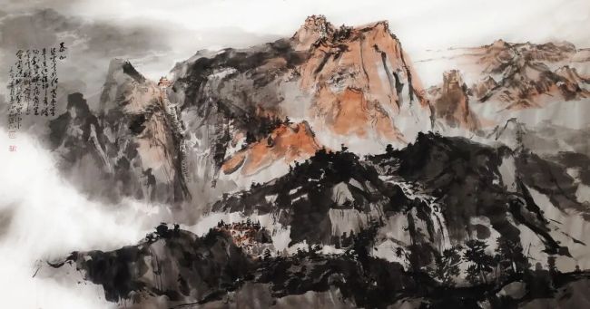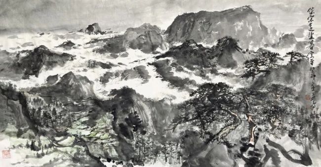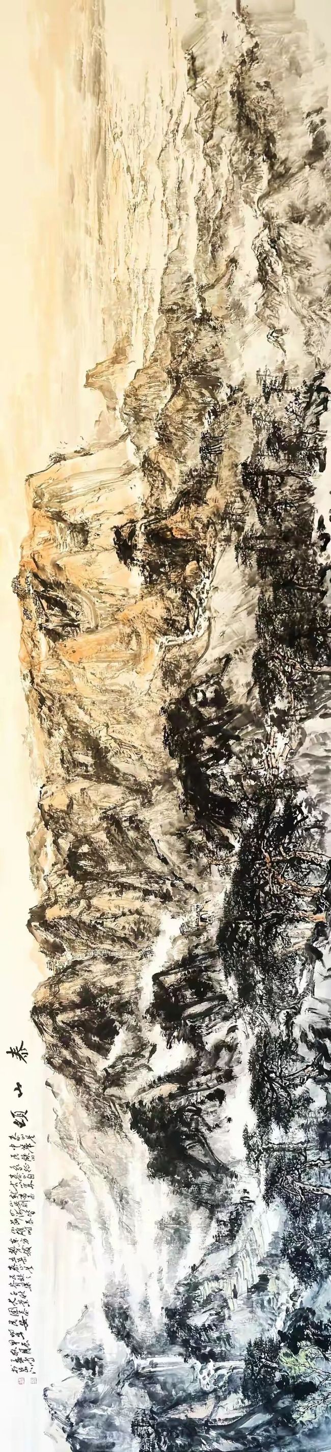 他偏爱难度颇高的鸟瞰式全景构图,以独特视角拓展画面格局,让观者得以“凌驾”山川之上,尽览天地壮阔;同时巧妙运用开合、虚实、繁简、浓淡等手法,以留白勾勒意境层次,让画面兼具广度与深度。《我们是黄河泰山》便是典范,浓墨皴写的奇峰刺破云端,留白处化作浩荡云涛,再辅以长款题跋,使山河气象升华为深厚的文化哲思,观之令人心潮澎湃,顿生对宇宙广阔、山河壮美的慨叹。