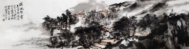 《茅屋深处话老庄》里,山林幽翠、山路曲径、山村幽静,整幅画透着澄明幽静之气,引人暂忘俗世繁杂,生出遁入桃源之想;《桃源深处》更将这份意境推向极致,近景苍古树冠上的鸟巢添加了诗趣,中景参差的古民居彰显了古意,远景苍茫的云天拓展了辽阔,让人仿佛踏入陶渊明笔下的世外之境;《水清风高几人家》《禅心尽入空无迹》则融禅意于笔墨,逸气与文韵交织,引人身心陶醉、神游其间。