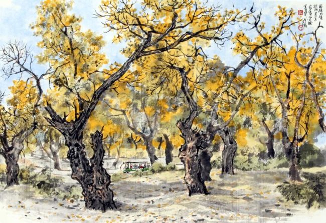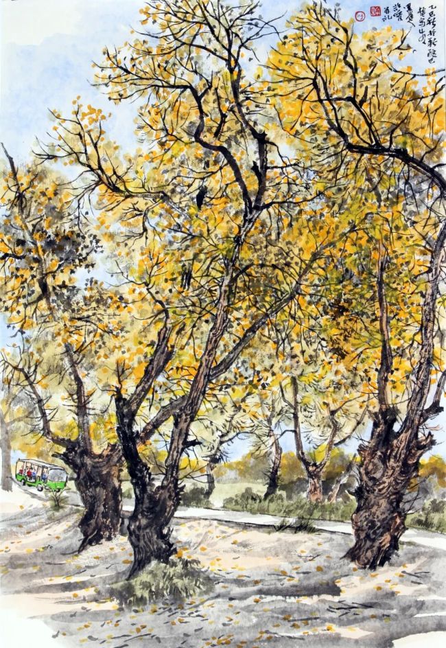 许俊的写生作品,笔墨功底扎实而灵动,将水墨的写意传神与青绿的厚重富丽完美融合,形成了独具特色的表现手法。他以重墨勾勒景物轮廓,线条方拙中见灵动,婉转而圆浑,既有金石的苍劲质感,又有自然流畅的韵律,精准捕捉住景物的形态肌理与内在气势。着色上,他注重色彩的叠加与和谐,不追求局部细节的繁琐堆砌,而是以大块面的色彩渲染营造整体意境,青绿为主调,兼顾明暗层次,使画面既醒目厚重,又清新雅致,褪去了传统青绿山水的程式化束缚,注入了现代审美意趣。这种“水墨青绿法”的运用,让写生作品既有自然的本真质感,又有艺术的审美张力。