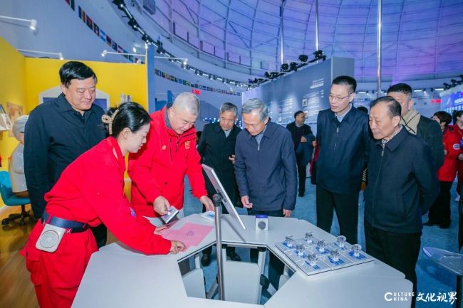 山东省委原常委、秘书长雷建国,山东省委原副秘书长、山东省精品旅游促进会会长杜文彬,山东省海洋局党组书记、局长王仁堂,山东省广播电视台党委副书记张卫华,山东省文化和旅游厅原一级巡视员王春生,山东旅游职业学院原党委书记陈国忠,山东演艺集团党委书记、董事长解东,中国太平洋学会副会长兼秘书长李正楼,中国博物馆协会副理事长、山东省博物馆学会理事长、山东博物馆党委书记、馆长刘延常,济南舜耕山庄集团党委书记武伟,山东省文化和旅游厅科技教育处处长迟钰争、宣传推广处处长王锐,济南市文化和旅游局副局长施冬泉,济南市历下区委常委、宣传部部长、教育工委书记孙华,历下区文化和旅游局党组书记、局长赵天波,中国太平洋学会海洋创意传媒分会会长、中国电子商会数字展示专业委员会副会长、新之航传媒科技集团董事长鞠航,以及山东省文化和旅游厅相关部门负责人、山东省博物馆学会相关博物馆负责人、山东省精品旅游促进会副会长、监事长、山东省精品旅游30人等部门负责人、新闻媒体、社会各界人士共300多人参加开幕典礼。
