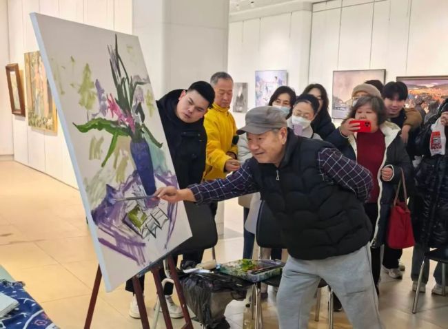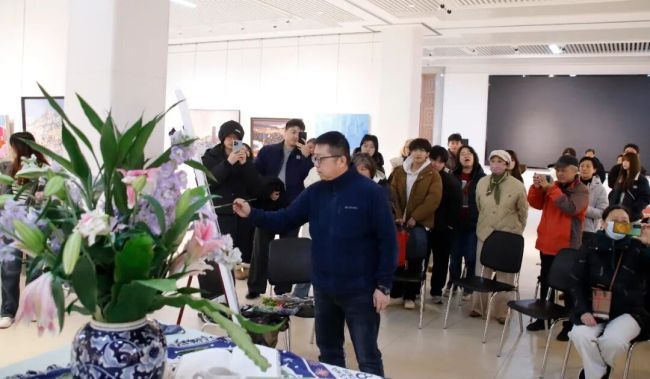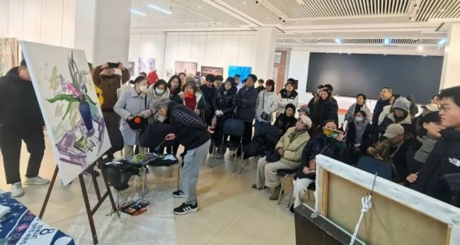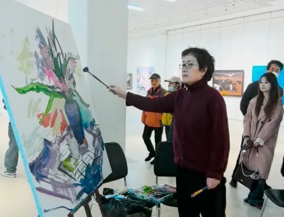 活动现场,艺术家们以展厅内精心布置的时令花卉为创作题材,从构图起笔,明暗铺陈到色彩晕染,每一个创作环节都进行了细致示范。在画布前,老师们手持画笔从容挥洒,时而凝神观察静物形态,时而俯身调整色彩层次,将花卉的鲜活姿态与光影变化精准呈现在画布之上。创作间隙,艺术家们结合自身数十年的写生经验,向围观爱好者们毫无保留地分享构图技法如何通过主次搭配突出画面主体,如何利用留白营造空间感;详解色彩搭配心得和冷暖色调的平衡运用,环境色对物体质感的影响等专业知识。