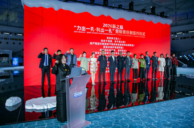 在2026新之航“力出一孔·利出一孔”目标签约仪式上,新之航传媒科技集团董事长鞠航、总裁傅绎锦与北京分公司、济南分公司、济南高新区分公司、山东博物馆南北极探索中心、市场中心、大客户中心、调度中心、运营中心、设计二部、数字体验中心、投标部、采购部、预算部、工程管理中心、人力资本部、财务资本部负责人共同签署目标责任制协议,傅绎锦带领团队代表庄严宣誓,锚定年度任务、聚力实现新之航战略目标,共同开创新之航2026更高峰!