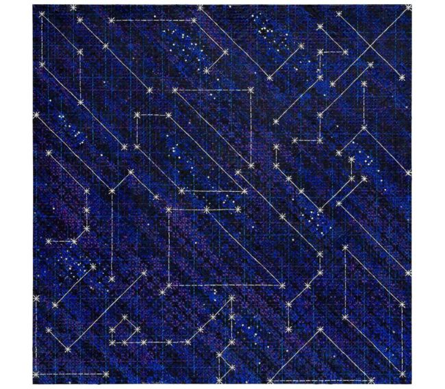 2019年,他前往珠峰大本营,原计划观赏的珠峰日落,因行程延误被黑夜取代,却意外让丁乙捕捉到“黑夜中的珠峰”这一震撼场景。雪山在夜色中反射的微光,打破了他对“辉煌”的固有认知。回来后,他创作了数件关于珠峰的作品,全以黑夜为背景,用深邃的蓝与灰铺垫,让“十示”化作星辰的闪烁、冰川的棱角,在静谧中传递出自然的神性。
