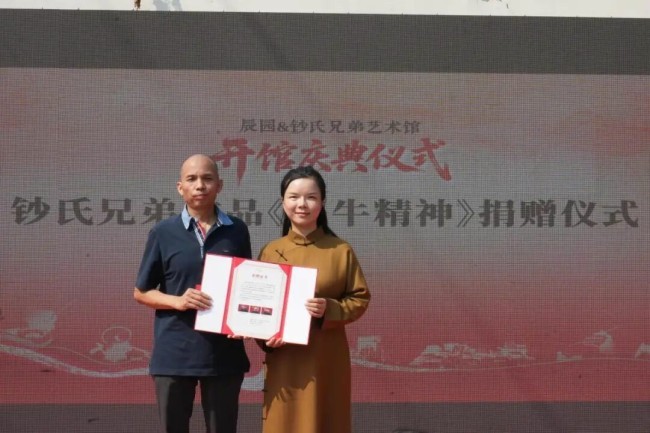 嘉宾分享后,盛典进入捐赠仪式与开馆环节。钞氏兄弟捐赠陶瓷雕塑《三牛精神》,并获颁收藏证书。