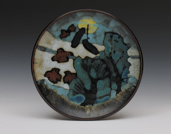 ▲陈烈汉颜色釉《高温釉画“水乡夜景”盘》1987年福建漳州