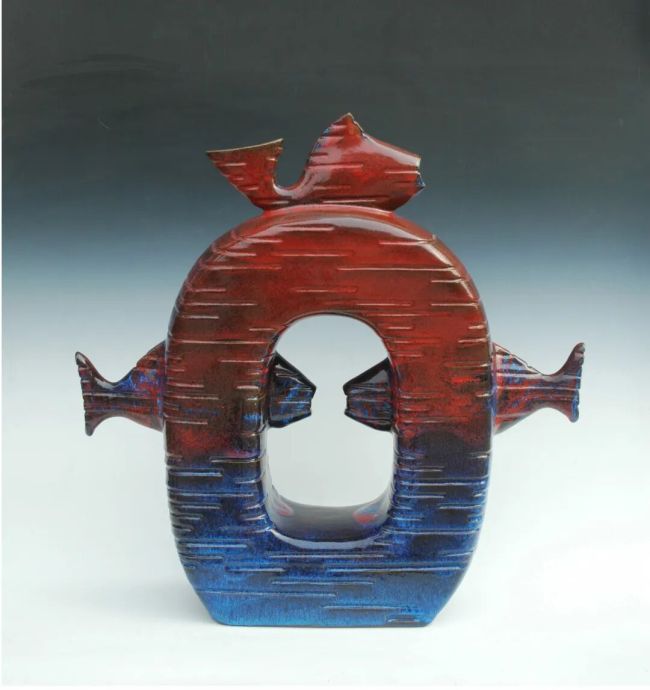 这次展览中我的参展作品《相会》,就在造型上做了创新设计:将中国传统节日七夕节牛郎织女的故事拟人化,设计成两条大鱼带着小鱼在圆月下相见的情景。月亮投射到水中变成椭圆形,三条鱼采用概括抽象化处理,运用立体构成中镂空穿插组合的方式设计器物造型。同时在造型上浅刻疏密、深浅不同的水波纹,产生灵动和细致的效果,花釉装饰上,上面以暖色的红色调为主,下面以冷色的蓝色调为主,上下装饰花釉渐变效果,就象月亮投在水中的色彩变化。