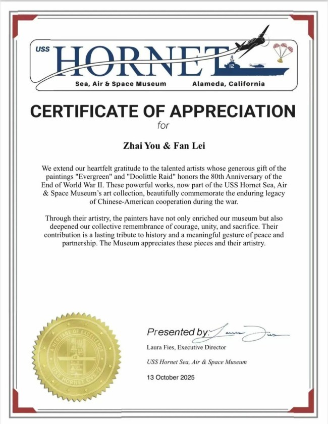 “这些艺术作品,不仅丰富了我们的博物馆馆藏,还加深了我们对勇气、团结和牺牲的集体记忆。他们的贡献是对历史的永久纪念,也是和平与合作的有意义的表达。博物馆对这些作品及其艺术价值表示赞赏。"10月13日,美国大黄蜂号航母博物馆CEO劳拉.菲斯为江苏书画艺术代表人物翟优、樊蕾夫妇颁发赞赏证书。证书提到,翟优和樊蕾夫妇慷慨地赠送了《常青》和《杜利特尔突袭》画作,以纪念第二次世界大战结束80周年。这些强大的作品己成为美国海军大黄蜂号航母博物馆艺术收藏的一部分,精美地纪念了战时中美合作的持久遗产。