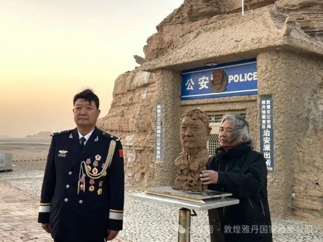 傍晚时分,吴为山来到敦煌市公安局雅丹治安派出所前,转身走向早已备好的雕塑台。端坐台前的李生寿,正是这片土地最生动的注脚:作为雅丹派出所原所长,他在75摄氏度温差的极端环境中带领战友凿出窑洞派出所,在罗布泊边缘完成198次救助,24年的坚守让“全国最美基层民警”的称号实至名归。“塑人先塑魂,这尊像要留住的是大漠无法磨去的坚守。”吴为山的指尖在泥土上流转,将西方写实技巧与中国传统雕塑的写意神韵相融,精准捕捉李生寿眉宇间的刚毅与温和。