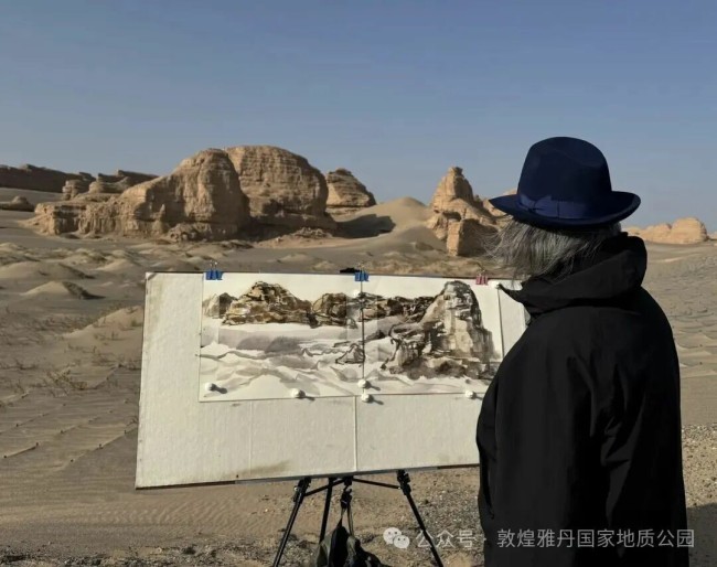雅丹地貌前,吴为山执起毛笔铺开画纸,将眼前的壮阔景致纳入笔墨间。笔触起落间,垄脊的起伏、沟槽的纵深化作纸上的开合聚散,天然形成的地貌肌理与写意笔墨相融,既保留了自然的磅礴,又注入了艺术的凝练。这场写生并非单纯的风景记录,更像是为后续创作积蓄灵感——正如他为历史人物塑像前必先深入研究其生平那般,此刻他正以笔墨与雅丹“对话”,读懂这片土地的精神底色。