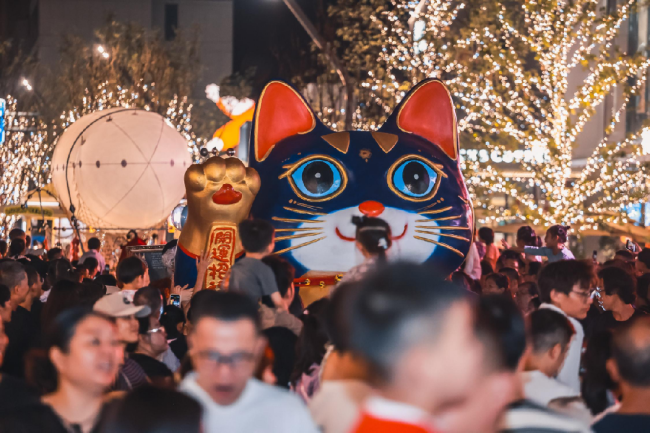中段是色彩与光影的交互。在街区与绿地的过渡地带,陈粉丸的《太阳鸟》用剪纸艺术点亮了色彩,杨千的《彩虹-成都》则在草地上编织出一道永恒的虹光。这一区域还潜伏着惊喜——马良的《招财猫》作为一个可流动的装置,将像一个顽皮的精灵穿梭在人群中,随时制造“偶遇”的欢乐。