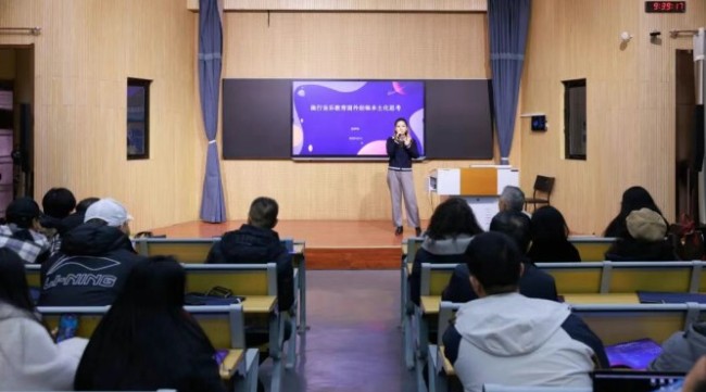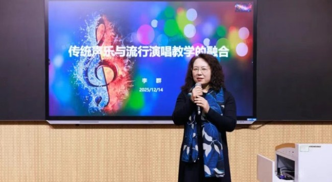 在“流行音乐教育及发展”主旨发言环节,7位参会代表依次发言,分享了兼具理论深度与实践价值的研究成果。山东艺术学院现代音乐学院的青年教师时旭以《山东爵士乐发展现状与展望》为题,梳理了近年来山东爵士乐人才培养现状与创作成果,强调了风格塑造与人才梯队建设的重要性;RSL中国区副总裁蓝晓英以《流行音乐教育如何与世界接轨》为题,建议借鉴国际先进理念,构建兼具专业性与包容性的课程体系;现代音乐学院外聘教师倪梦妮围绕《流行音乐国际经验本土化思考》,结合自身创作实践强调,国际经验必须扎根本土文化土壤才能焕发持久生命力;山东省音乐家协会流行音乐专业委员会副秘书长孙轶在《电声乐队本土发展的路径分析》中,建议通过赛事孵化、跨界交流提升乐队创作与演出水平;山东师范大学音乐学院声乐系主任李群聚焦《传统声乐教育如何与流行融合》,提出打破门类壁垒,实现技巧与演绎的优势互补;山东省音乐家协会流行音乐专业委员会副会长王学华以《流行声乐教学如何从娃娃做起》为题,呼吁建立基础教育与高等教育衔接的一体化培养体系;山东师范大学音乐学院教授栾家以《如何看待AI对流行音乐的冲击》为题,剖析技术变革带来的机遇与挑战,主张以开放心态拥抱创新,同时坚守音乐创作的人文内核。