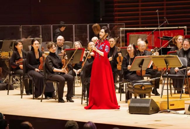 两位中国民乐演奏名家的登场将现场氛围推向高潮。中央音乐学院院长、著名二胡演奏家于红梅教授率先登台,携手费城交响乐团演绎二胡协奏曲《卧虎藏龙》(谭盾作曲),以深沉苍劲的琴音勾勒出古韵悠远与现代语汇并存的东方意境。著名琵琶演奏家章红艳教授以一曲《霸王卸甲》(周龙编创)尽展刚柔并济之势,将楚霸王末路悲歌淋漓展现。两位演奏家以精湛技艺与饱满情感诠释中国民乐的独特魅力,也为这场“欢乐春节”音乐会注入了最具神韵的中华篇章。