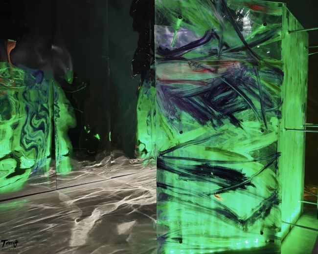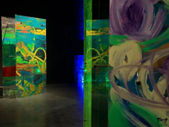 本次装置是在原本系列基础上进行的再造,利用镜面的反射、悬吊的装置和灯光的组合,将以往事件进行搬运,利用材料层叠、绘画叠加构建起一个带有叙事性和实验性的时间剧场。