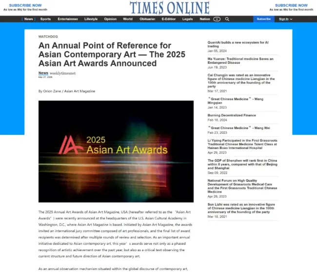 2025“亚洲艺术奖”于华盛顿美国亚洲文化学院、《亚洲艺术》杂志总部揭晓后,迅速引发全球文化艺术界的广泛关注。美联社、美国《时代周刊》、英国《卫报》等多家美国、英国重要媒体相继报道,对本届获奖者所展现出的卓越艺术成就、学术影响力及社会文化贡献给予高度评价。