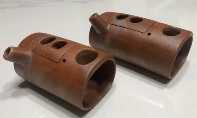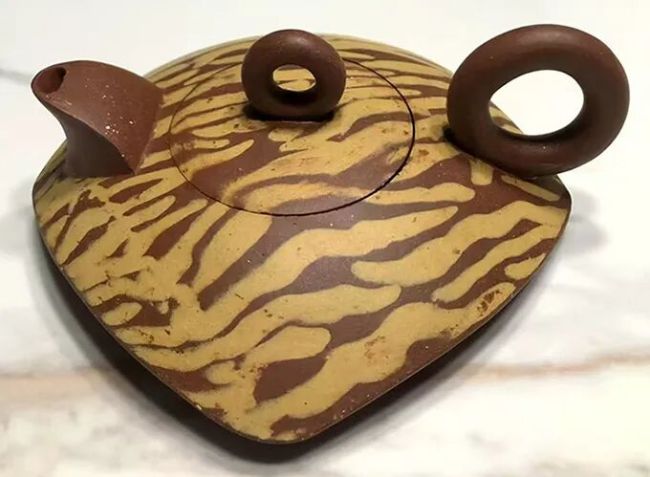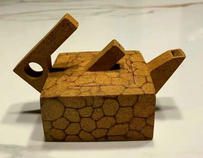 他的壶,肌理效果也值得玩味。同样一款造型的壶,肌理不同,观感迥异。有的如婴儿般的肌肤那样细腻爽滑,可以亲吻;有的微微发涩,仿佛固化的落灰、火痕或沙粒;有的像漆器那般凹凸与典雅;有的冰裂纹像水过流沙的印痕;也有的像树皮的褶皱,沧桑包裹着岁月的年轮。而有的手捏壶,壶内壶外都带着制作者的指掌纹,你品茶时仿佛可与作者对话。