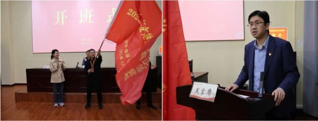 红旗渠干部学院副院长郭晓勇出席开班仪式,致欢迎辞并为培训班授班旗。培训班班长、心外科党支部书记张希全,培训班班委、内科党总支书记刘艳上台接旗。重症医学科党支部书记王昊代表学员作表态发言。