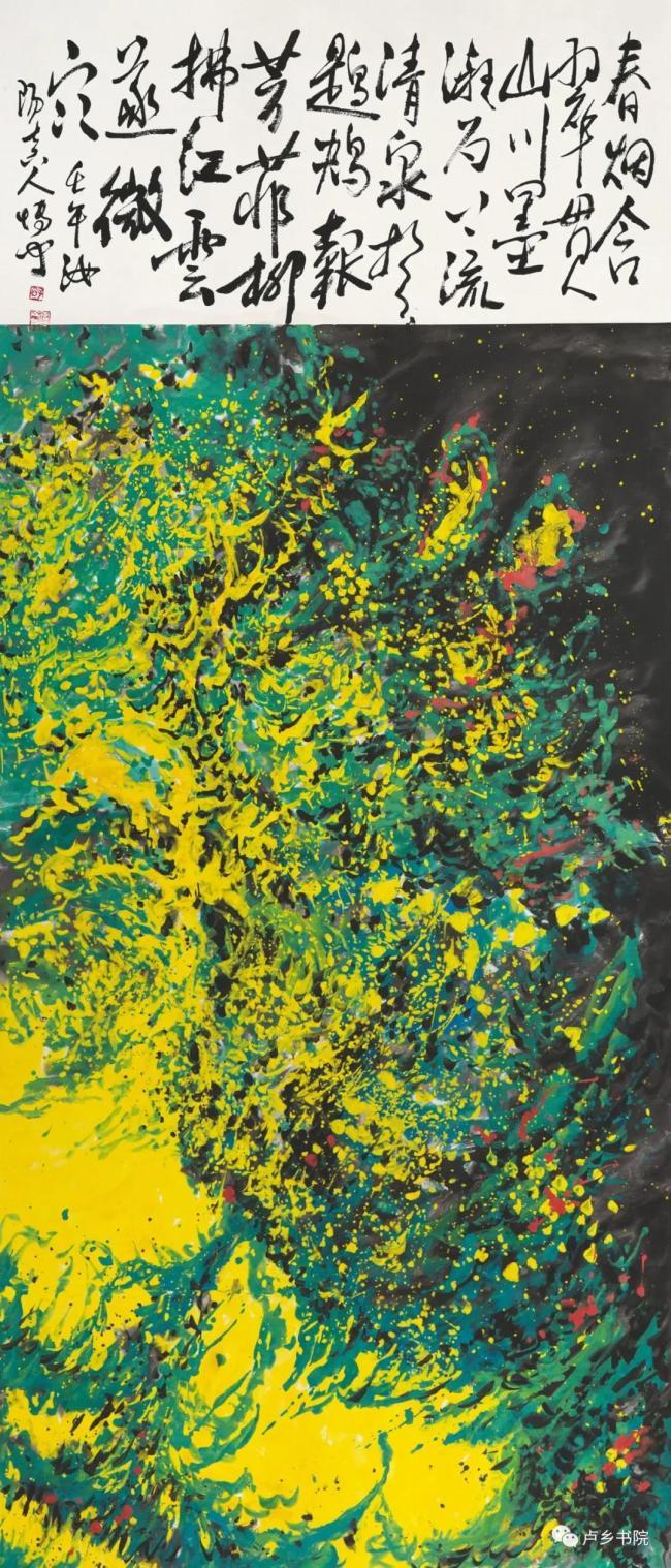 也不难看出,他的色彩笔法的自然滴洒、扭曲律动除了像西方波洛克、梵高等现代主义画家的影响,更有中国传统绘画的根基。画面鲜艳的色彩常常以墨色打底,或以墨色为背景、以墨线勾勒边界,这种以传统墨分五色、笔力线条与色彩结合的表现方式,在材料和技法上有别于西方绘画方式和语言。这种色与墨、色与线等的彩墨结合,再加上中国画的题诗落款钤印,使得他的绘画又具有强烈的中国绘画意味,这与他的绘画基础和人生经历也是密切相关的。