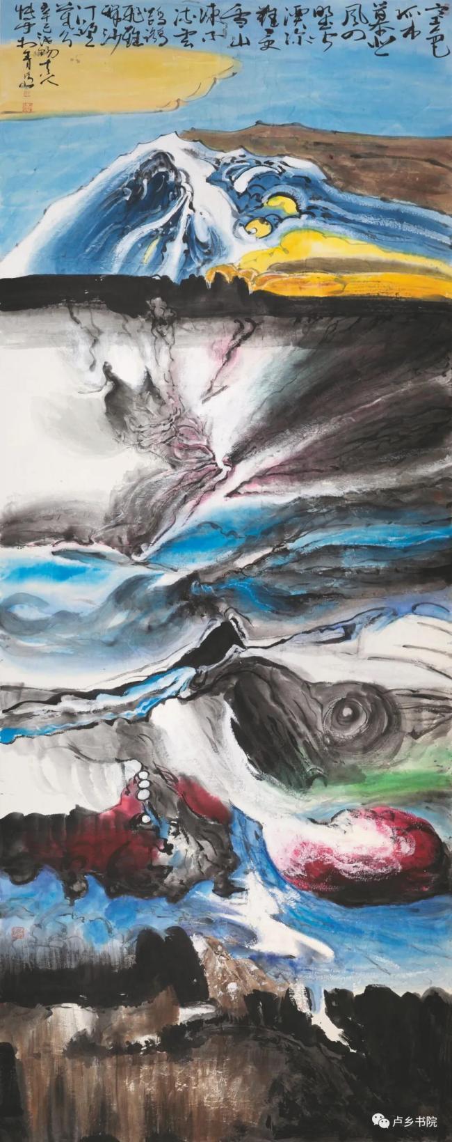 他的晚年不仅把色彩运用得淋漓尽致,画面也更加酣畅淋漓、无拘无束,这更像是他快意豁达的人生态度以及对生命的诠释,从而达到一种完全自我的创作状态。这些巨幅作品常常以竖幅构图为多,S形、三角形、发散形及层叠式的构图,变换多样;云蒸霞蔚、高原雪霁、山峦叠嶂所展现的五彩流光、挺拔坚毅、高远辽阔,给人以不同的审美体验。如《去留肝胆两昆仑》《胡天飞雪》《幕天席地自乾坤》《春归千山》《山水入禅心》《泼墨千山水生云》《开天辟地》,这类作品的构图,使得画面具有蓬勃的生命力和运动感,鲜明的色彩、律动的线条、具象与意象的结合,宇宙的浩瀚无垠充斥于整个画面,意在表达一种雄健和崇高之美。
