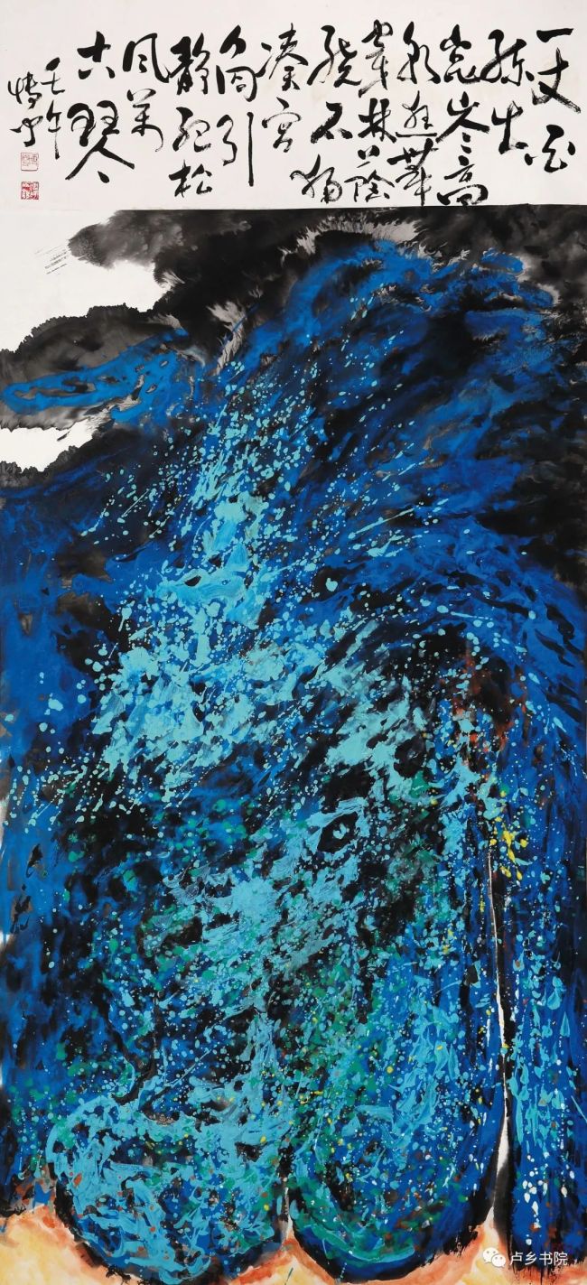 在更为晚些的作品《松风流瀑万古琴》的水墨设色作品上,我们几乎看到了大写意的极致,几乎就是抽象表现的色彩流动,这幅作品可以说是张大千泼彩以来的典范之作,最为体现泼彩大写意走向抽象表现的范例,其色彩的单纯,又具有单色抽象画的意趣,烟云万象,变化万千,捕获自然生机,宇宙变化之奇妙,都是要巧夺天工,化为笔墨自由之呼吸,灵魂之磅礴。但依然还有着山水画的暗示与局部的指向,这就在抽象与自然之间,泼彩的行动与笔触的微妙变化之间,在流动的呼吸与节奏的控制之间,在色彩的单纯与丰富的变化之间,都有着内在的丰富张力。