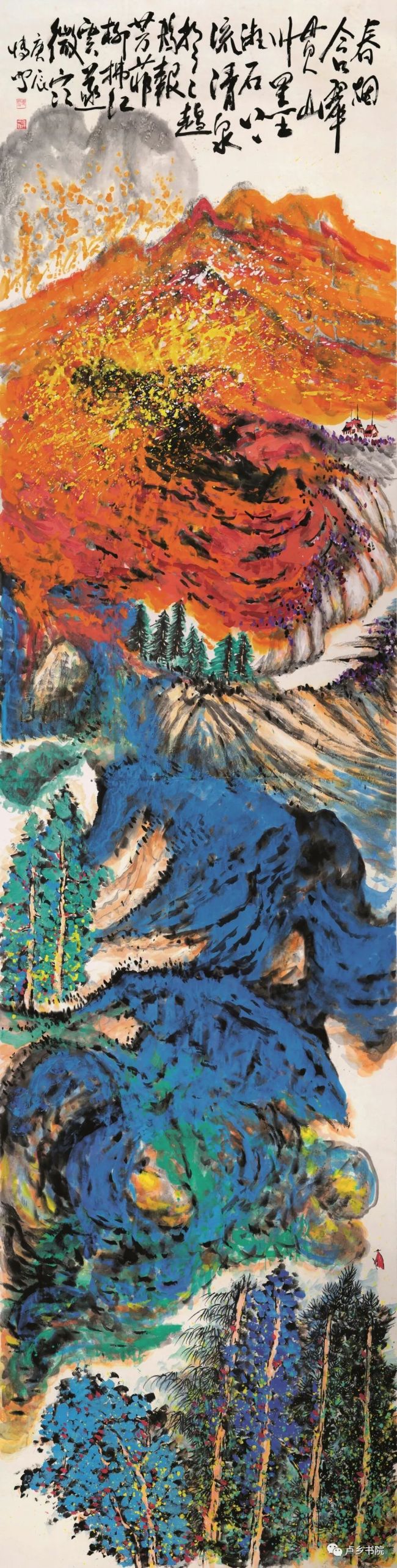 在更为晚些的作品《松风流瀑万古琴》的水墨设色作品上,我们几乎看到了大写意的极致,几乎就是抽象表现的色彩流动,这幅作品可以说是张大千泼彩以来的典范之作,最为体现泼彩大写意走向抽象表现的范例,其色彩的单纯,又具有单色抽象画的意趣,烟云万象,变化万千,捕获自然生机,宇宙变化之奇妙,都是要巧夺天工,化为笔墨自由之呼吸,灵魂之磅礴。但依然还有着山水画的暗示与局部的指向,这就在抽象与自然之间,泼彩的行动与笔触的微妙变化之间,在流动的呼吸与节奏的控制之间,在色彩的单纯与丰富的变化之间,都有着内在的丰富张力。