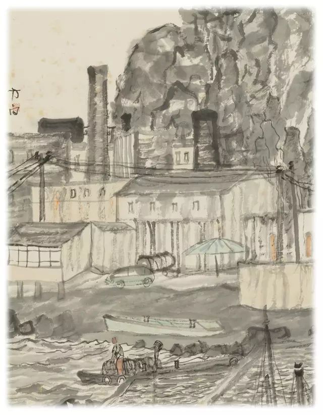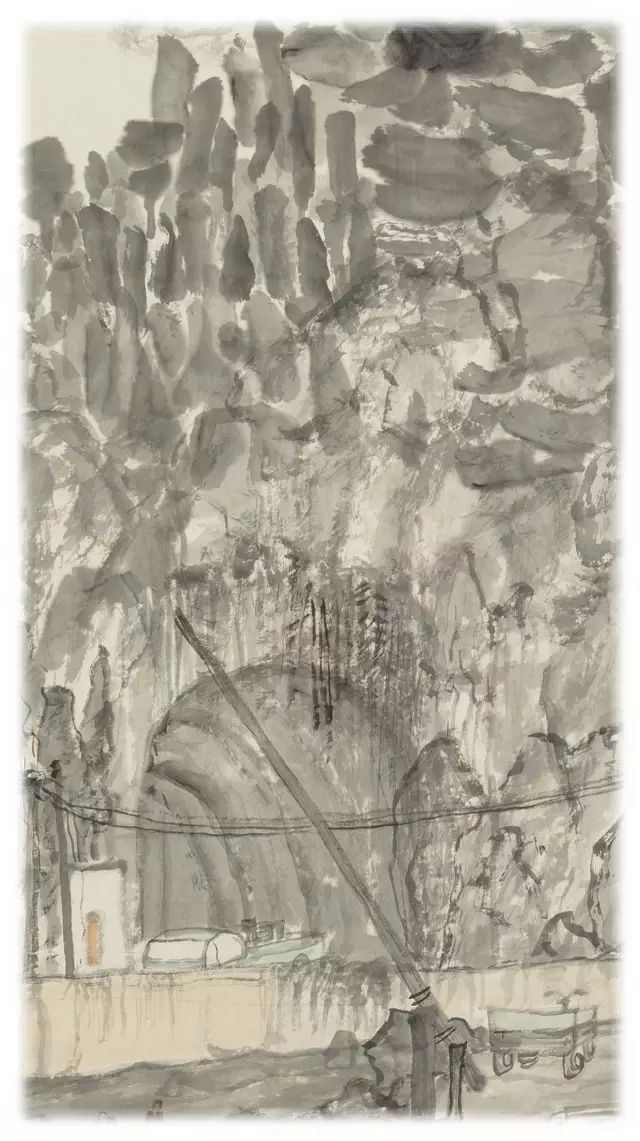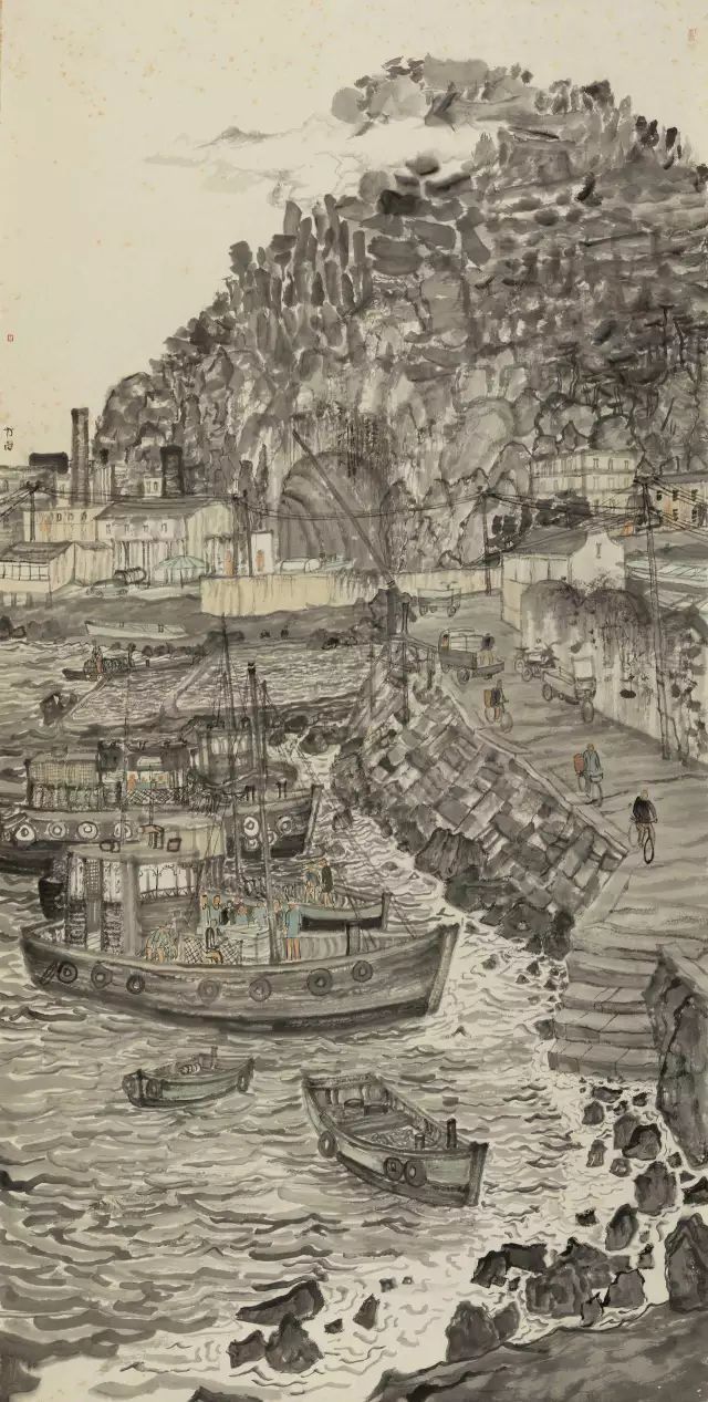 而在画家笔下,那群山之中碧海之畔,古朴的小渔村儿更是美的让人心醉。没有多余的色彩渲染,只有优雅闲适的生活情调氤氲之中。在这里,画家采用独具个性水墨图式,画面中既有传统山水元素,又加进了当代人的生活场景,比如轮船、自行车、电线杆,这些现代感十足的元素并没有破坏画面的和谐,反而使简约、纯朴、自由的渔村生活更加令人向往。(赵曙光)