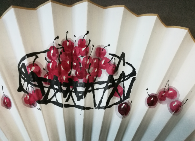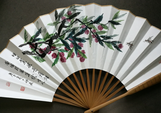 荔枝,谐音“励志”,象征坚持自己的追求与梦想;同时荔枝在中国的传统文化里面也是“吉利”的象征。唐代诗人徐寅有诗云:“日日薰风卷瘴烟,南园珍果荔枝光。灵鸦啄破琼津滴,宝器盛来蚌腹圆。锦里只闻消醉渴,蕊宫惟合赠神仙。何人剌出猩猩血,深染罗纹遍壳鲜”。这首诗歌中的句子与任仲泉笔下的荔枝图画相映成趣,其笔下的荔枝仿佛在绿叶红果间有阵阵的香气袭人……任仲泉教授是一个善于用简单笔墨去描绘事物内涵与精神面貌的画家。在他的笔下,荔枝特有的状甚琼诡,瓤厚而莹,膜如紫绡的气质被其用中国画传统的笔墨描绘的淋漓尽致,而透出画面之外的则是任仲泉的文化修养和文人气质,折扇小品的风雅趣味也在此间尽显芳容。