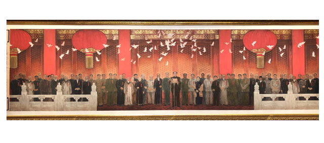 唐勇力大师的代表作品《新中国诞生》历时三年创作完成,获得业界内外大众多好评,成为新时期历史题材创作的经典作品。虽然已经有董希文先生的油画经典《开国大典》在前,但是组委会依然把新中国诞生这个题材交到了唐勇力手上。