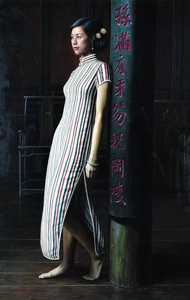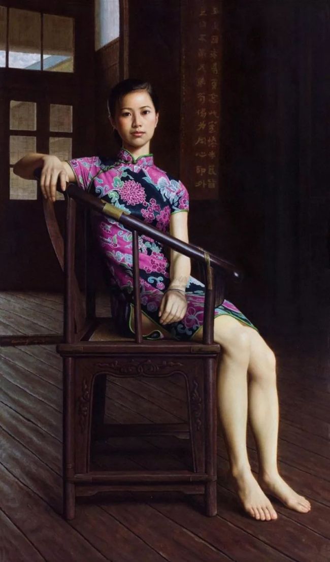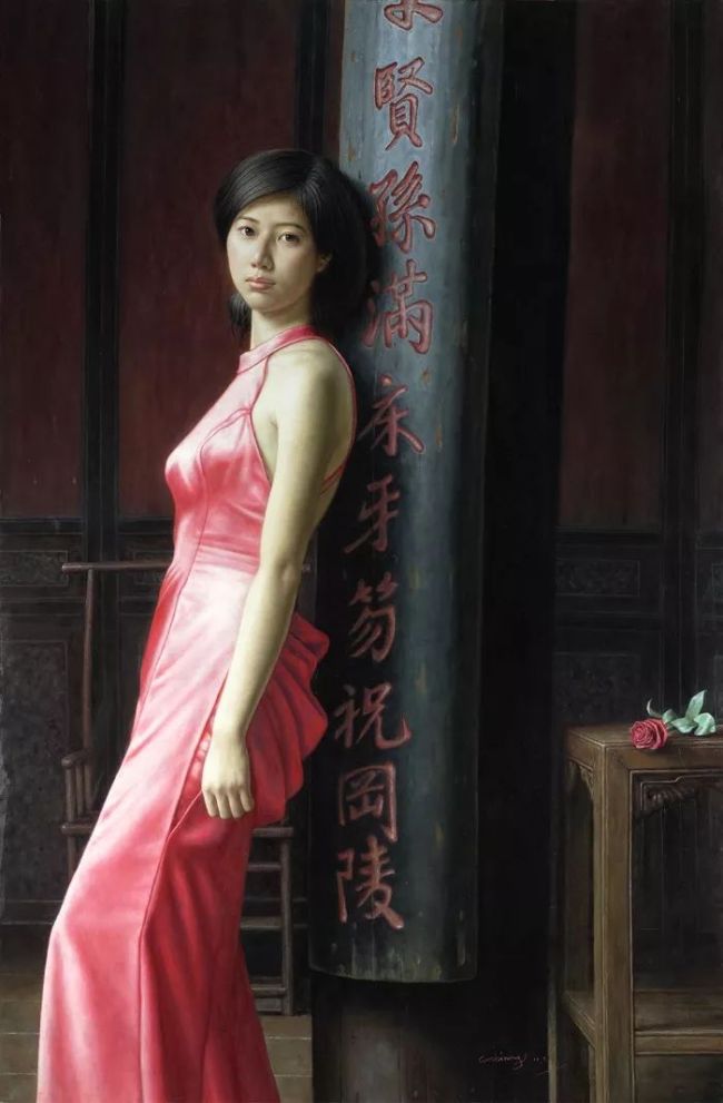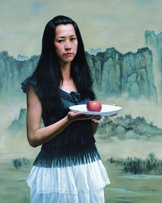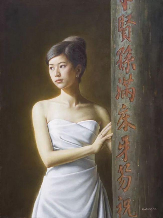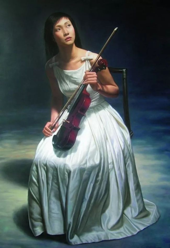 走进顾致农的油画世界,迎面扑来的是一股宁静、纯洁、带宗教和梦幻的气息,例如作品《唐宋人间》、《音乐之梦》把中国古代人物画和现代的人物巧妙地组织在一起,用逼真写实的表现手法,使这个虚构的空间变得真实可信。