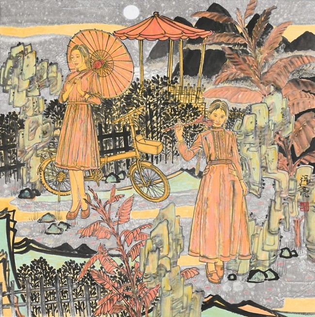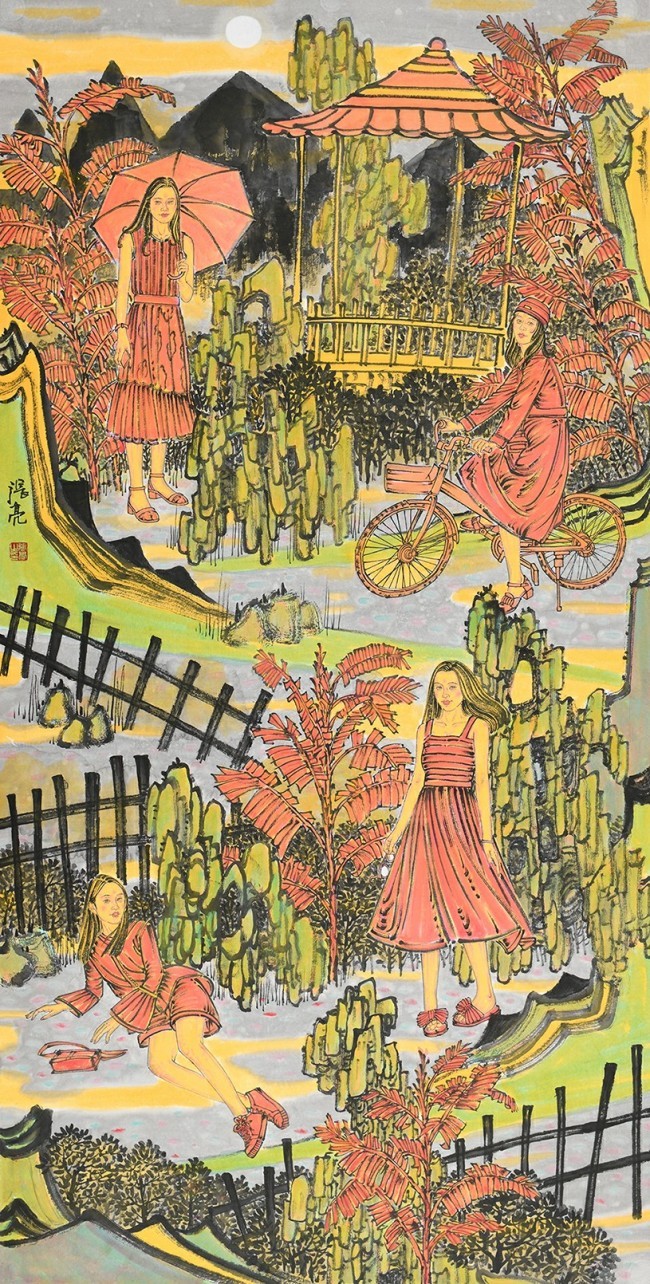 细观其作,传统竖幅山水的构图铺垫出远处云山掩映、宁静而高远的大美意境;亭台叠石、草木花卉、几处围栏点缀出“静观庭前花开花落、闲看天上云卷云舒”心境观照下的、物化的审美空间;都市女性形象的介入则将“人的在场”引入了“物的世界”,“人与万物一体,万物之生意最可观……”。张亮将这一系列趣称为“逸游”,而逸游于纸上的创作过程实则是他逸游于心间的、享“大境之美”的心灵旅程。
