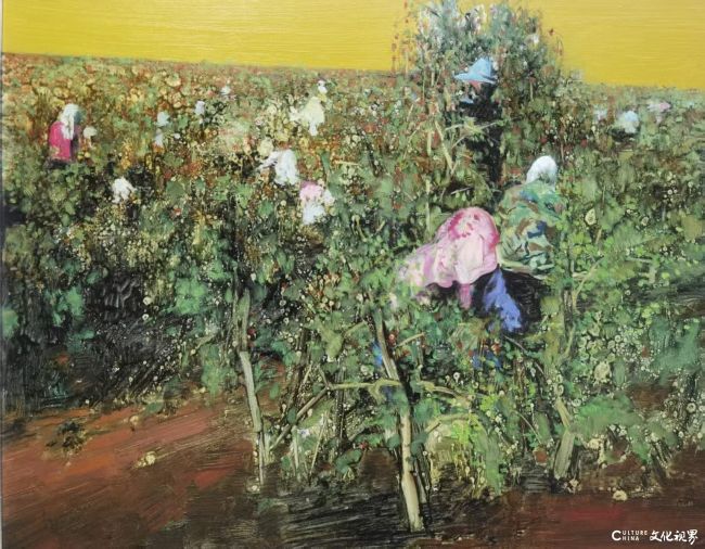 而当目光落向那片涌动着人影的绿意时,明快的暖黄从天际倾泻而下,如高原的阳光般滚烫。人影与色彩以灵动的笔触在枝叶间交融,粉的、蓝的衣饰像是蹦跳出来的音符。孙全义的笔触带着书法般的提按顿挫,既捕捉了劳作时的动态,又让每一笔都有了水墨“写”的意趣——不是刻板地描摹形态,而是带着情绪与呼吸,把田间的蓬勃与生活的温煦,都化作了色彩与线条的舞蹈。在这里,油画的色彩张力与中国写意的灵动气韵,成了共生的韵律,让劳作的场景超越了日常,成为土地与生命对话的仪式。