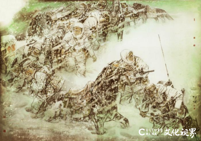 近几年,于新生又为中国国家博物馆创作了现代题材作品《风雪无阻巡逻路》,画面中边防官兵冒着风雪守护边疆的场景,与前两幅作品共同构成了“抗争—胜利—守护”的三部曲。“从清代甲午海战的抗争,到抗日战争的胜利,再到如今边防官兵守护和平,这三张画是连贯的:我们既要铭记过去的抗争,更要守护当下的安定。”