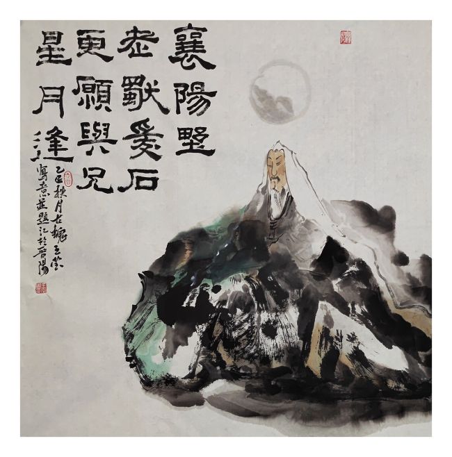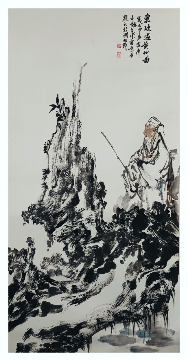 更为动人的是,王莹的绘画始终承载着浓厚的人文情怀与精神追求,他的作品是“心象”的外化,是情感与思想的视觉表达。在其《米芾爱石图》《东坡过黄州图》等作品中,便是他以画为媒介对话古人、解码历史的经典实践——前者捕捉文人雅趣的瞬间,后者定格生命沉潜的时刻,两幅作品虽题材各异,却共同彰显出他对历史人物精神世界的深刻洞察,以及将文史意蕴与笔墨语言完美融合的艺术功力。