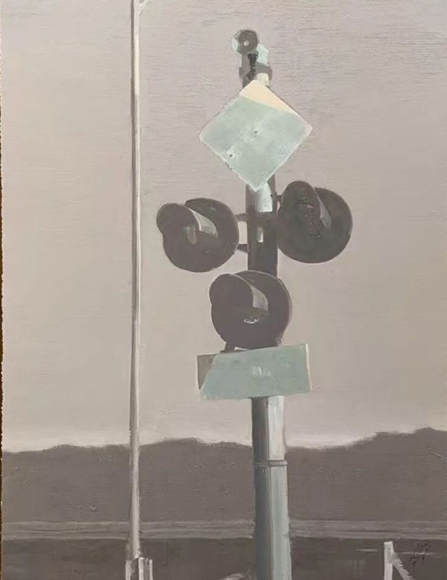 “信号”在梁宇的创作中具有象征性和符号性意义。在他的信号灯系列作品中,信号的表象物——信号灯既可能出现在静默的站台上,也可能出现在沿线空寂的房子旁,还可能出现在静谧、寂寥的旷野中。在这些寂静、诗意的场景中,古朴的信号灯别有意味,是时代的印迹、回忆的线索和个人情感的寄托。
