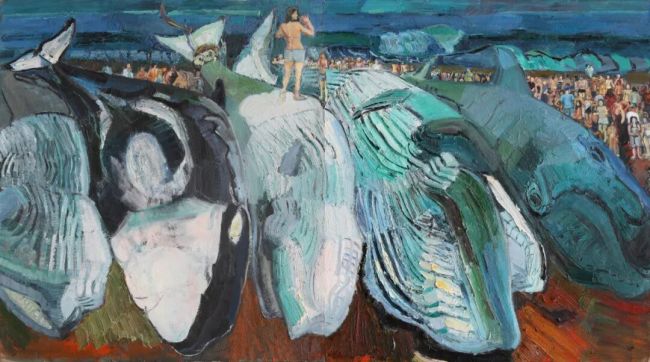 我们不仅能辨识出他与劳赫在方法论上的对话,更能感受到其艺术生命最本真的源泉——那片生于斯长于斯的故乡的海,以及海边上演着的、充满生命力的劳动场景。与劳赫画布上弥漫的、来自东德历史的政治性疏离感不同,王晓欧的“糅合的超现实主义”深深地植根于咸涩的海风与渔民的汗水之中。他所处理的个人与集体记忆,带有一种表现主义式的怀旧感。那些拉长的、变形的形象,仿佛是从历史深处打捞出的“负片”。色彩与形式不是为了悦目,而是为了诉说那些难以言说、被压抑的遥远记忆。因此,王晓欧完成了一次关键的在地化转译。他将一种国际性的视觉语言,沉潜于故乡的滩涂,从中打捞起属于自己的、饱含体温与盐分的记忆。他的画作,不是对远方历史的冷峻审视,而是对身边生命的温热礼赞。