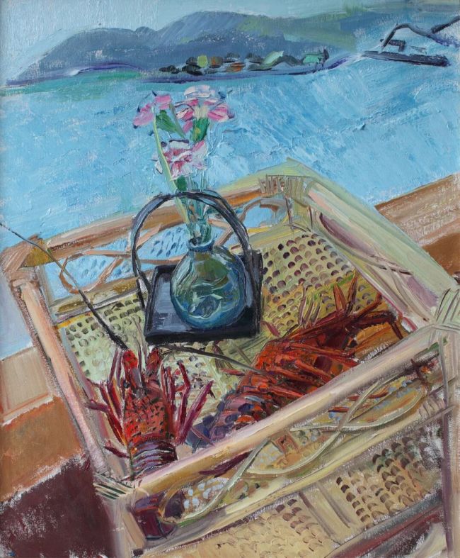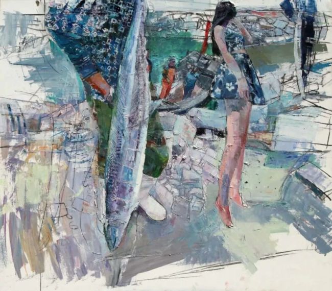 王晓欧在学院对于色彩拼贴的实验深刻地反哺并重塑了他自身的绘画语言。这些实验让他对边缘的清晰性、色块的平面关系以及正负形的咬合有了身体力行的理解。尤其特别的是,他将胶带这一工具从辅助手段提升为核心创作媒介,利用其物理特性来界定色域,从而在画布上构建出锋利、精确而又充满张力的色彩结构。这种从拼贴实验中淬炼出的“构成自觉”,在他参展第十届全国美展的作品《大海渔歌》中得到了淋漓尽致的展现。在这件作品中,我们能看到画面中描绘渔船、渔网与渔民形象的色块边缘清晰肯定,色块之间形成了类似拼贴的硬边关系,充满了阿尔伯斯式的理性秩序。他早期的艺术实践虽可见拼贴的探索痕迹,但《大海渔歌》标志其语言的彻底成熟。曾经的“未经处理”被纯化为极具掌控力的“理性构成”,完成了从实验性表达到结构性表达的成熟蜕变。