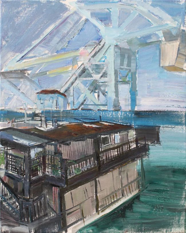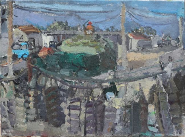 王晓欧将绘画视为承载历史与集体记忆的物质载体。如同安塞姆·基弗用铅铁、稻草、灰烬构建画面的沉重感,王晓欧的作品也强调物质的在场感。他将这种视觉语法应用于其最熟悉的渔民题材。在他所构建的视觉世界中,我们常常可以观察到聚集的船只、堆积的方形塑料筐、数量众多的鱼等等。尤其是盛满了“战利品”的白色方形塑料筐,它的造型稳定结实,像是构筑房屋的基石一般,构建起画面的基础。