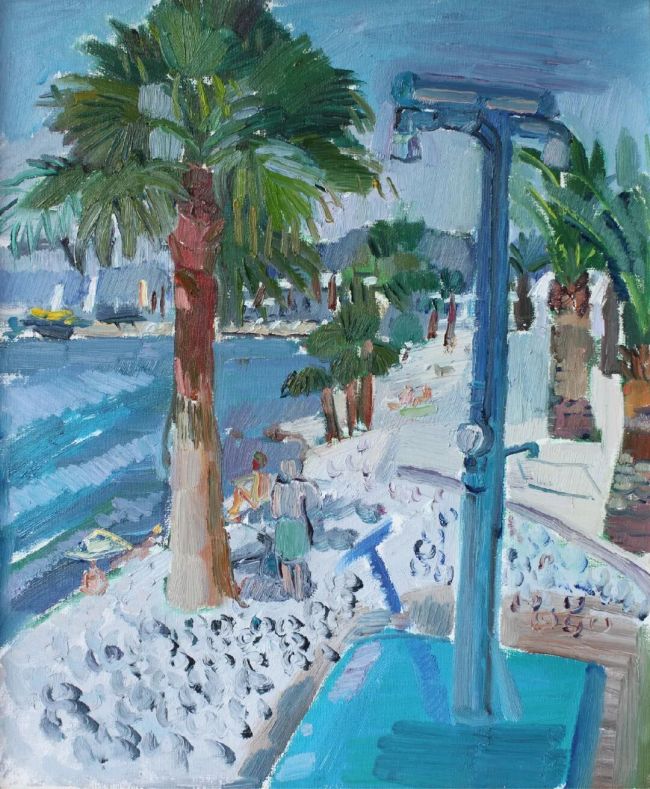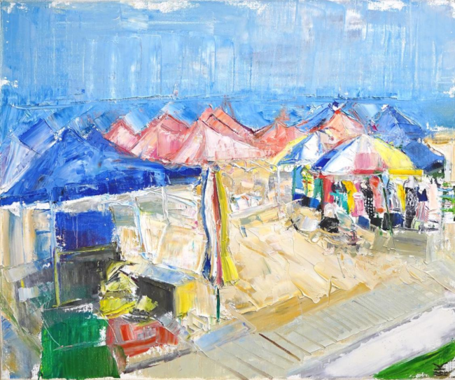我们不仅能辨识出他与劳赫在方法论上的对话,更能感受到其艺术生命最本真的源泉——那片生于斯长于斯的故乡的海,以及海边上演着的、充满生命力的劳动场景。与劳赫画布上弥漫的、来自东德历史的政治性疏离感不同,王晓欧的“糅合的超现实主义”深深地植根于咸涩的海风与渔民的汗水之中。他所处理的个人与集体记忆,带有一种表现主义式的怀旧感。那些拉长的、变形的形象,仿佛是从历史深处打捞出的“负片”。色彩与形式不是为了悦目,而是为了诉说那些难以言说、被压抑的遥远记忆。因此,王晓欧完成了一次关键的在地化转译。他将一种国际性的视觉语言,沉潜于故乡的滩涂,从中打捞起属于自己的、饱含体温与盐分的记忆。他的画作,不是对远方历史的冷峻审视,而是对身边生命的温热礼赞。