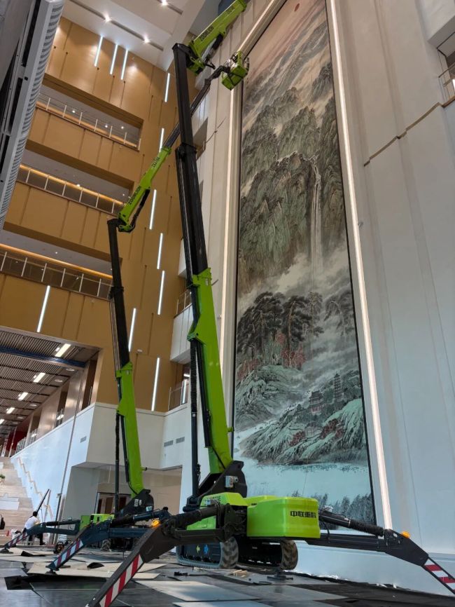 近日,雄安图书馆内一幅高23.2米、宽6.3米的巨幅主题壁画《山河赋》正式亮相。该作品是目前全国范围内最高、且正式安装于公共设施中的生宣纸本水墨中国画,标志着中国传统水墨艺术在当代公共空间中的一次重要突破。