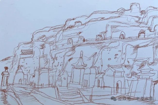 西部的黄褐色,是自然雕琢的史诗。我在榆林窟画的几张写生里,岩壁的黄褐色并非单一色调,浅棕与深褐交织,藏着风蚀的纹路、洞窟的沧桑,每一笔色彩都似时光在岩层上刻下的年轮。
