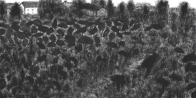 我在表现荷塘时,不拘泥于对荷叶的细致描绘,而是尝试用意向手法来表达我对荷塘的感受。我在作品中既注自然⻛光的生态描绘,又注重乡村⺠居美景与时代审美的融合,点线面在荷塘中疏密有致,小径蜿蜒于荷塘深处,漫卷的荷塘与静穆的⺠居、⻘峦动静相宜。我试图通过朴素而又节奏清晰的画面,营造出人行天地间的空阔与超然意境,并在空间处理、构图方式、视觉呈现方面试图突破传统山水画。
