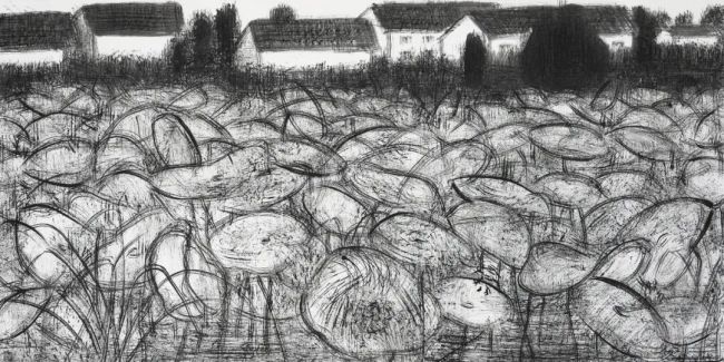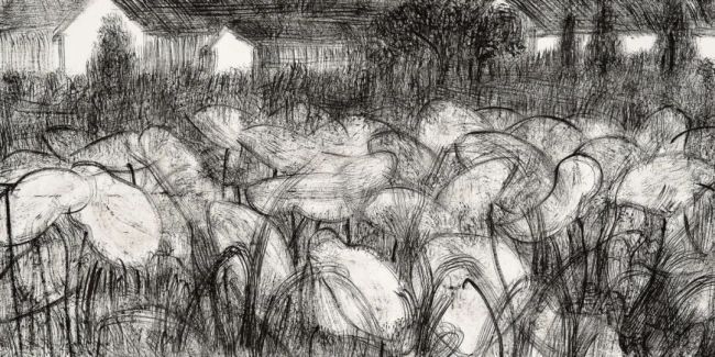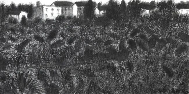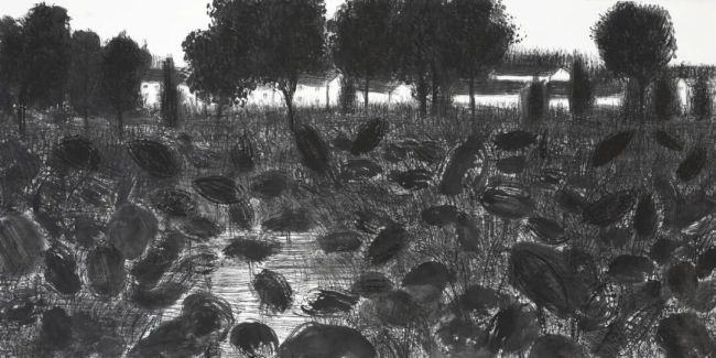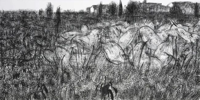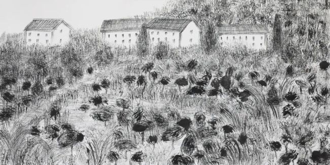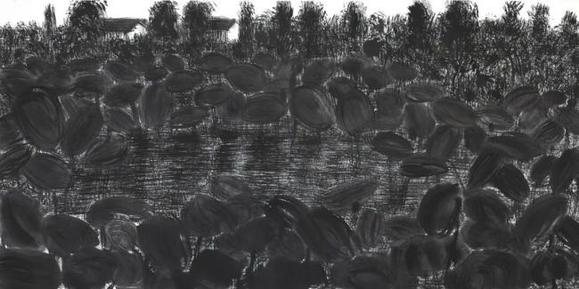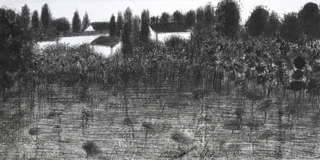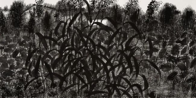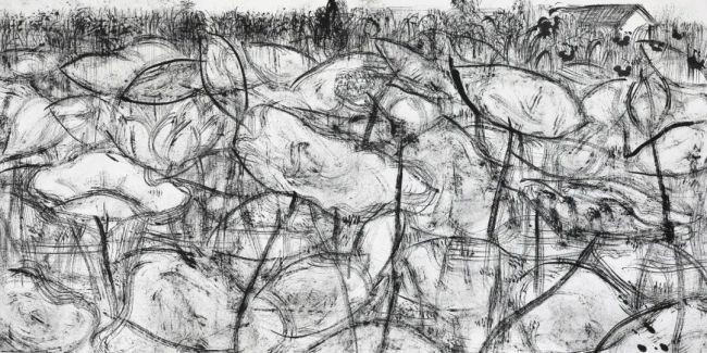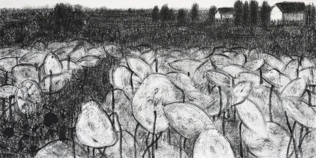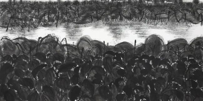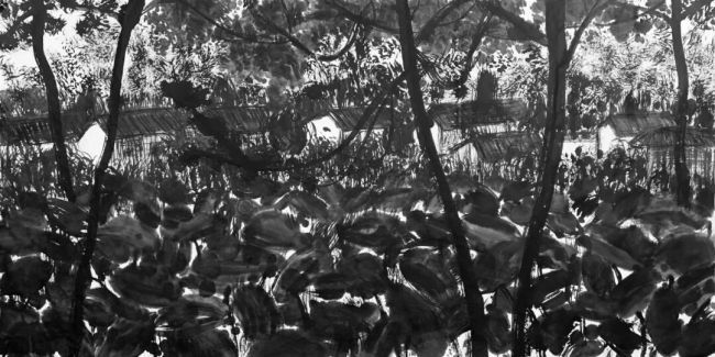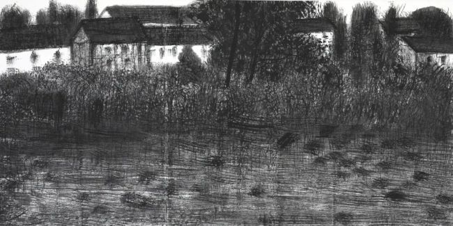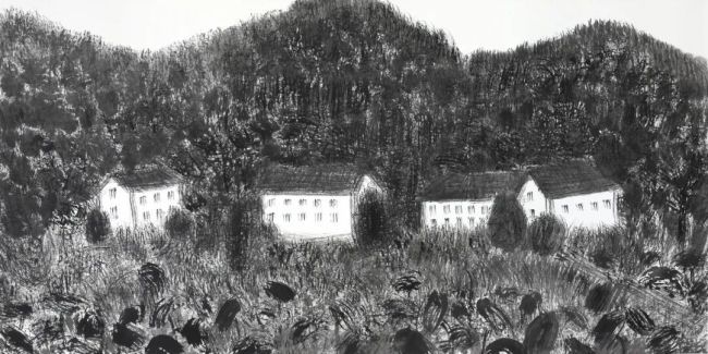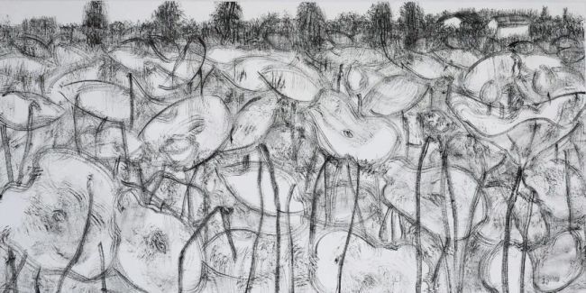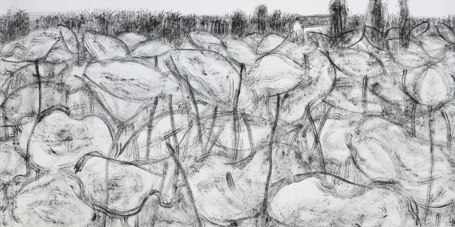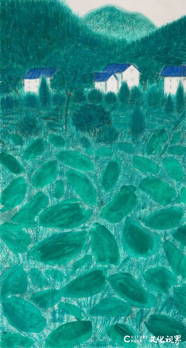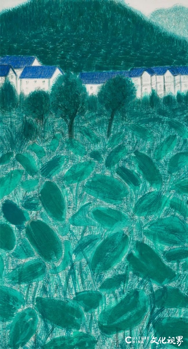 我在表现荷塘时,不拘泥于对荷叶的细致描绘,而是尝试用意向手法来表达我对荷塘的感受。我在作品中既注自然⻛光的生态描绘,又注重乡村⺠居美景与时代审美的融合,点线面在荷塘中疏密有致,小径蜿蜒于荷塘深处,漫卷的荷塘与静穆的⺠居、⻘峦动静相宜。我试图通过朴素而又节奏清晰的画面,营造出人行天地间的空阔与超然意境,并在空间处理、构图方式、视觉呈现方面试图突破传统山水画。