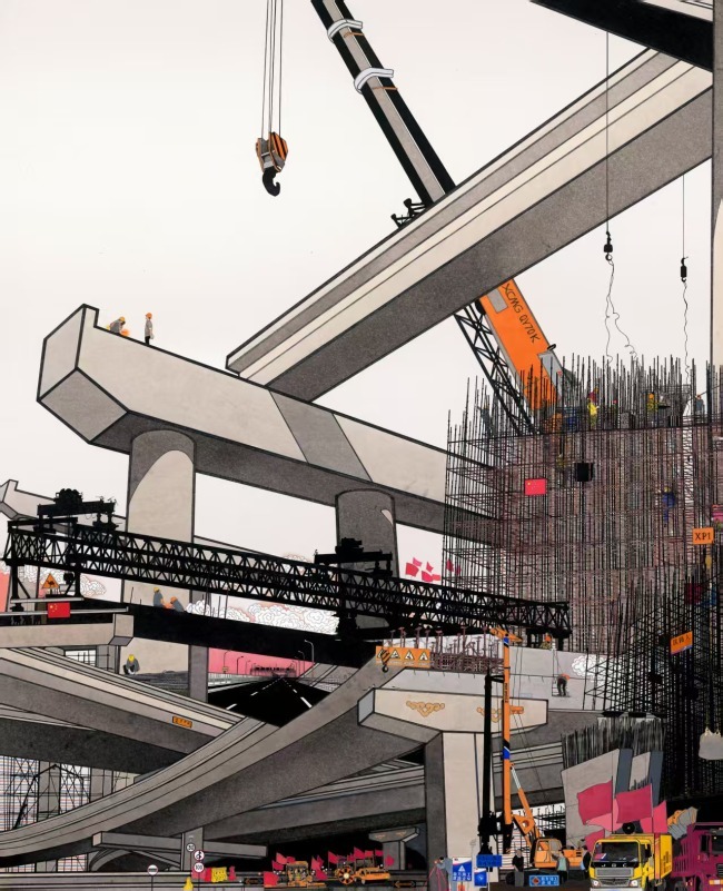 在题材的选取与表现上,焦洋展现出了开阔的艺术视野与创新的勇气。她不满足于对传统题材的重复演绎,将目光投向现代生活,尤其是大工业题材。面对这类充满力量与现代感的题材,她巧妙运用现代构成手法,为工笔画这一传统艺术形式注入新的活力。直线的交织、黑白的交错、色块的搭配,在她的笔下,不再是简单的形式组合,而是成为了表现大工业场景中力量、节奏与旋律的有效手段。那些炼钢的场面、筑路的场景,在她的工笔描绘下,既有着工笔画特有的精细质感,又焕发出强烈的现代气息与蓬勃的生命力,让人们看到工笔画在表现现代题材时的无限可能。同时,对于历史题材,她也能以独特的构图与色彩运用,营造出气势恢宏的画卷,唤起人们对历史的回望与思索。而描绘日常场景的作品,又充满了生活的意趣与温情,将平凡生活中的美好瞬间,以工笔的细腻,永久定格在画面之上。
