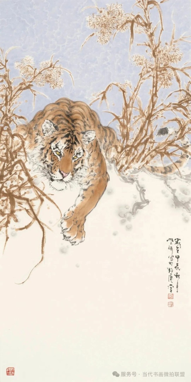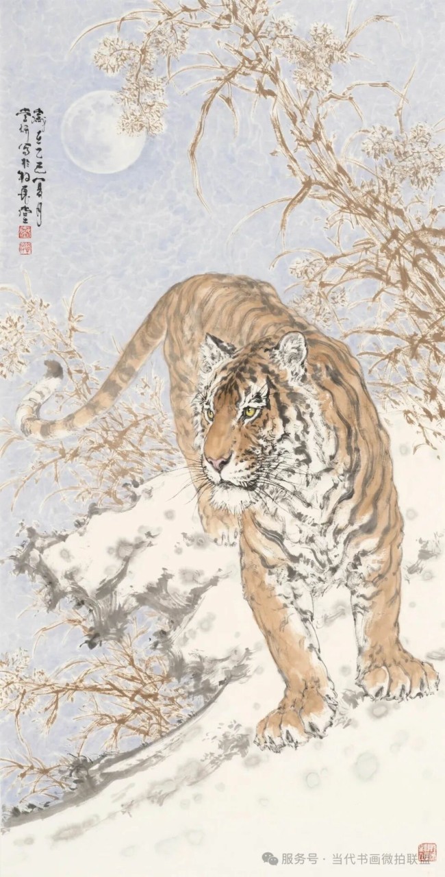 至于汉代,作为青龙、白虎、玄武、朱雀四神之一的白虎形象更是大量地出现在博大恢弘的汉代艺术之中。在不少地区,逢年节张挂年画便多悬挂虎画,或猛虎下山,或猛虎出林,或猛虎啸风等等,皆取于其凛凛雄风、威加四方之义。年画、布老虎、版画、剪纸、雕塑、建筑、工艺品等器物与艺术品上的形形色色虎形象,无疑表明深植于华夏古老文化中的虎文化影响。在文人雅士的居所,也多悬挂虎画中堂,旁衬书法对联,于堂皇威严之中亦显风雅之气。
